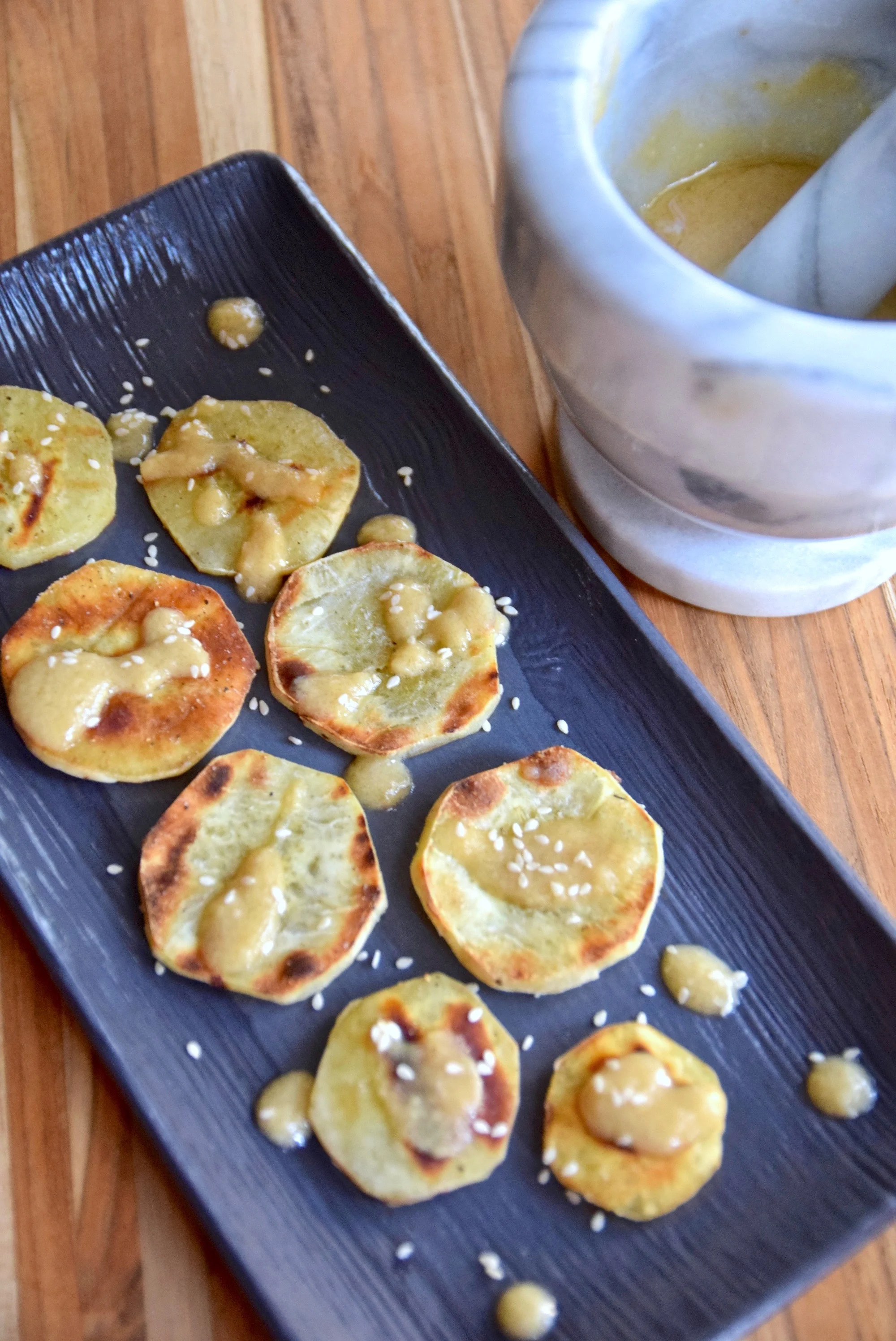 - Steam the sweet potatoes until tender, 30-40 minutes, depending on their size. While they're cooking, make the sauce: pound the garlic and ginger in a mortar until very smooth and then add the coconut aminos, miso, vinegar, sesame oils and water.