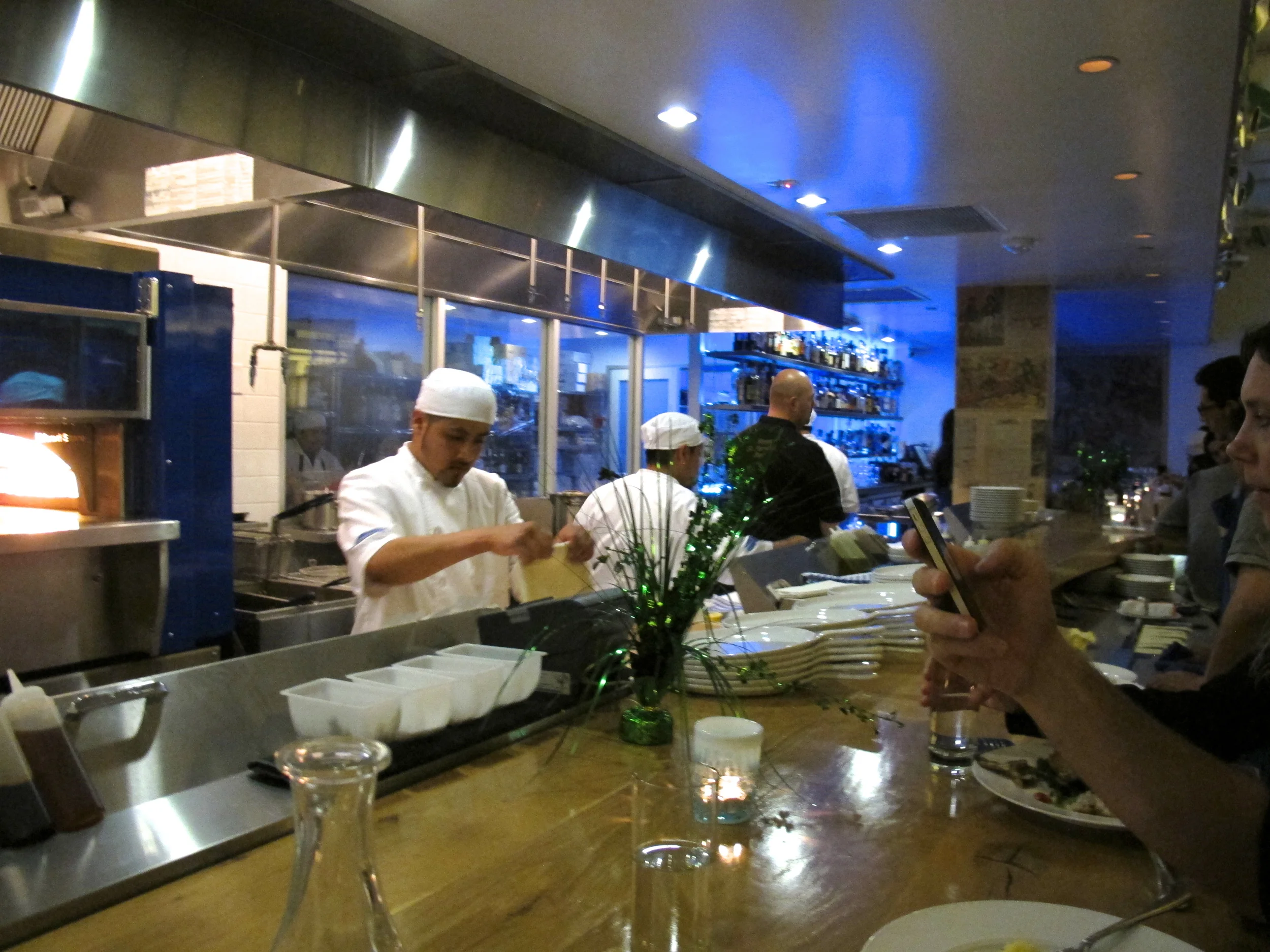 It was Saturday night, and the eve of St. Patrick's Day, so I tried not to understand. We sat at the "counter," which is different than the bar, but the only thing left when I tried for a reservation that morning, though the communal table and heated patio were also options. The counter looks into the very open kitchen and pizza oven which certainly kept us entertained and warm.