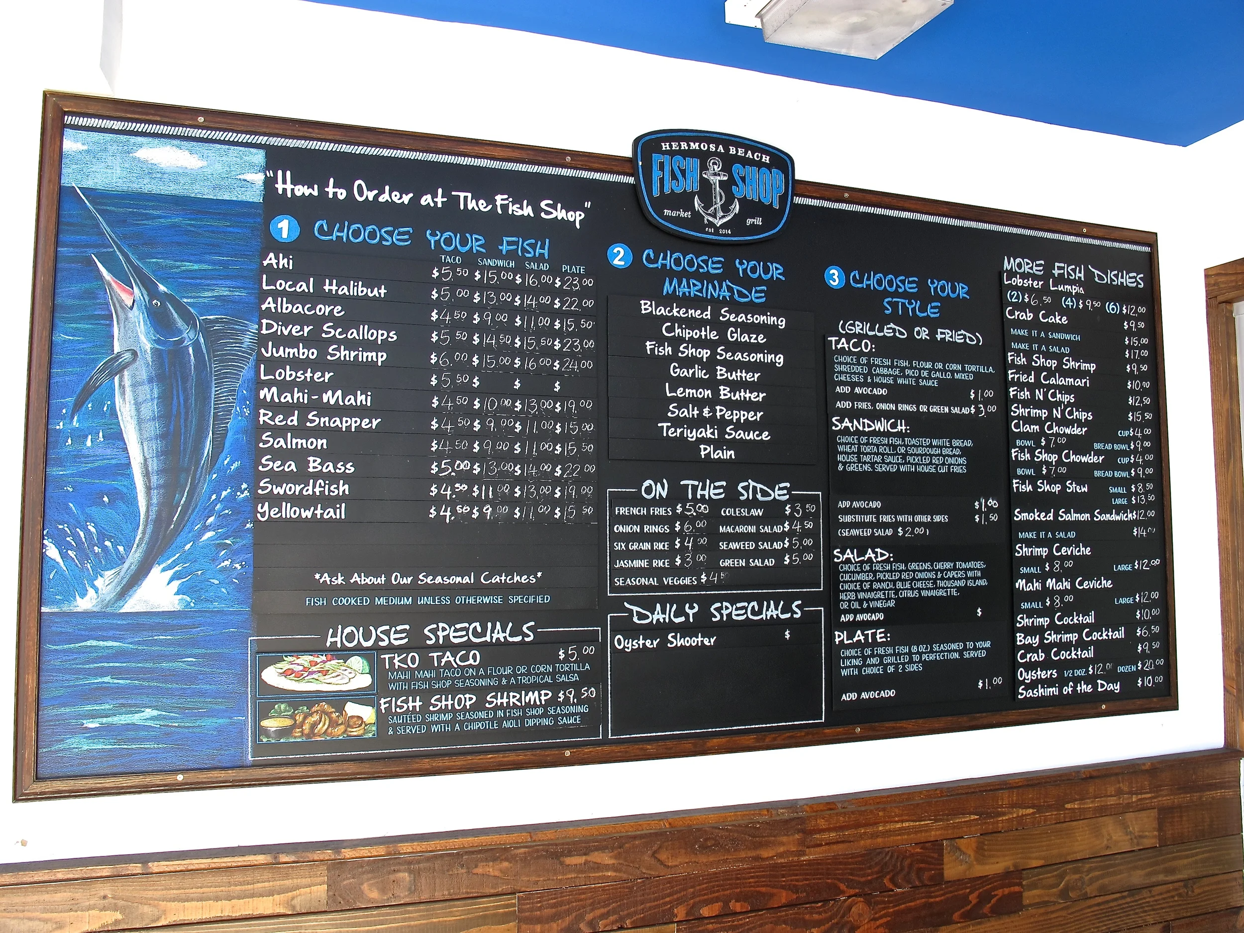 I do love fish so I thought it was at least worth a drive to check out what the Hermosa Beach Fish Shop was doing. Before even walking in, I stopped to read a board outside listing a dozen different fish, and I knew then, that this was not a fast food fish taco stand.
