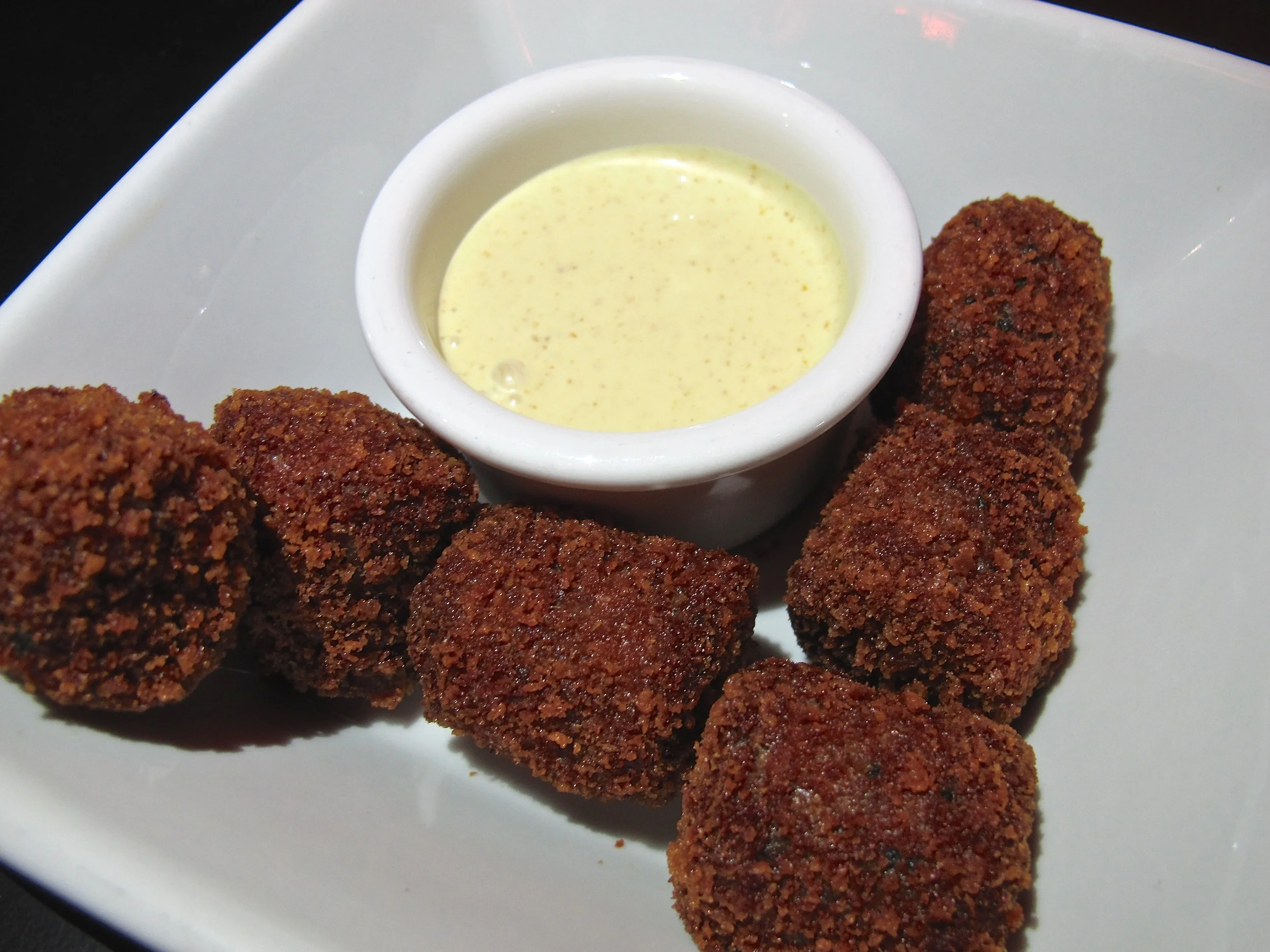 The crab cakes reminded me of the tater tots. They were very fried, but the skin was nice and crisp, and not too thick with good crab flavor inside. The curry aioli was a soothing, creamy companion.
