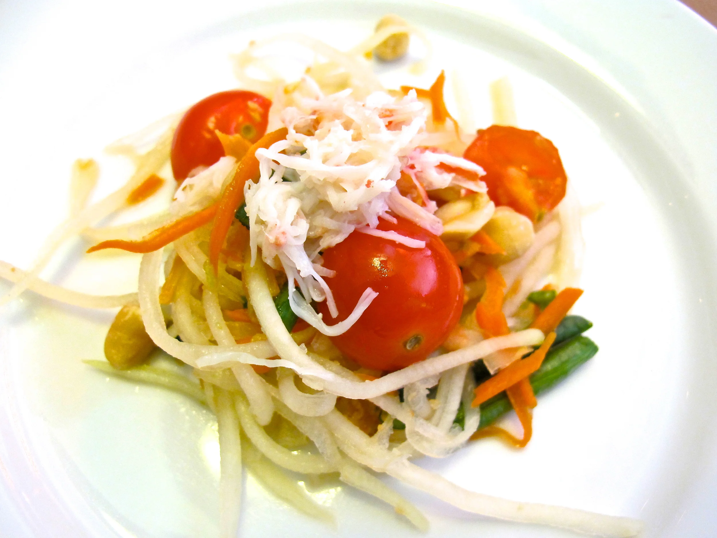 The dishes were simple, but fresh, in presentation and substance. Plain white plates arrived for the first course with small bits of light crab on a green mango salad with tomatoes and roasted peanuts.