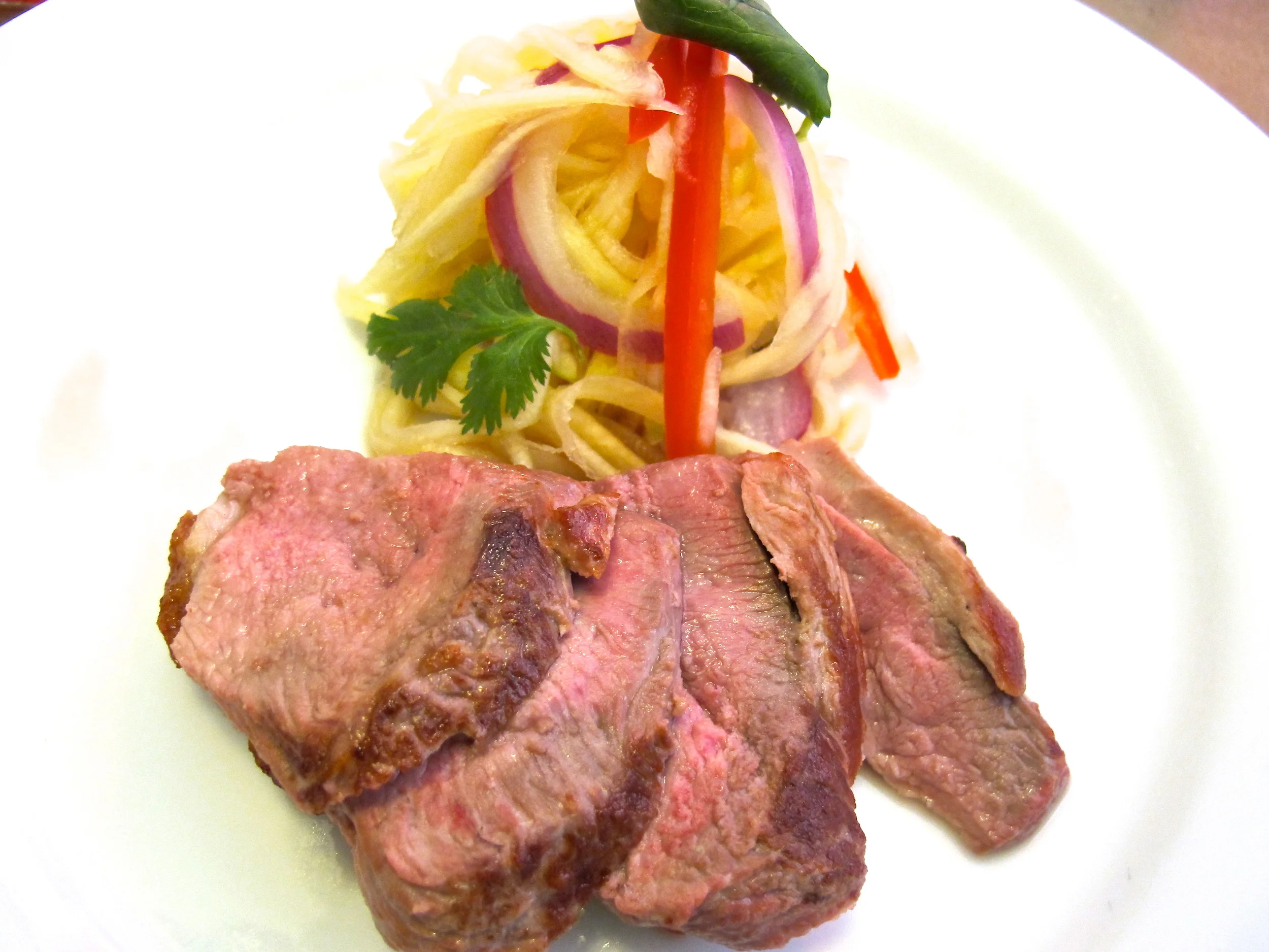 This airy dish was the ying to the pan roasted duck's yang. The duck was perfectly cooked and served with a heat inducing green mango salad with chilies, lime and cilantro - all the flavors you want in good Thai cooking.