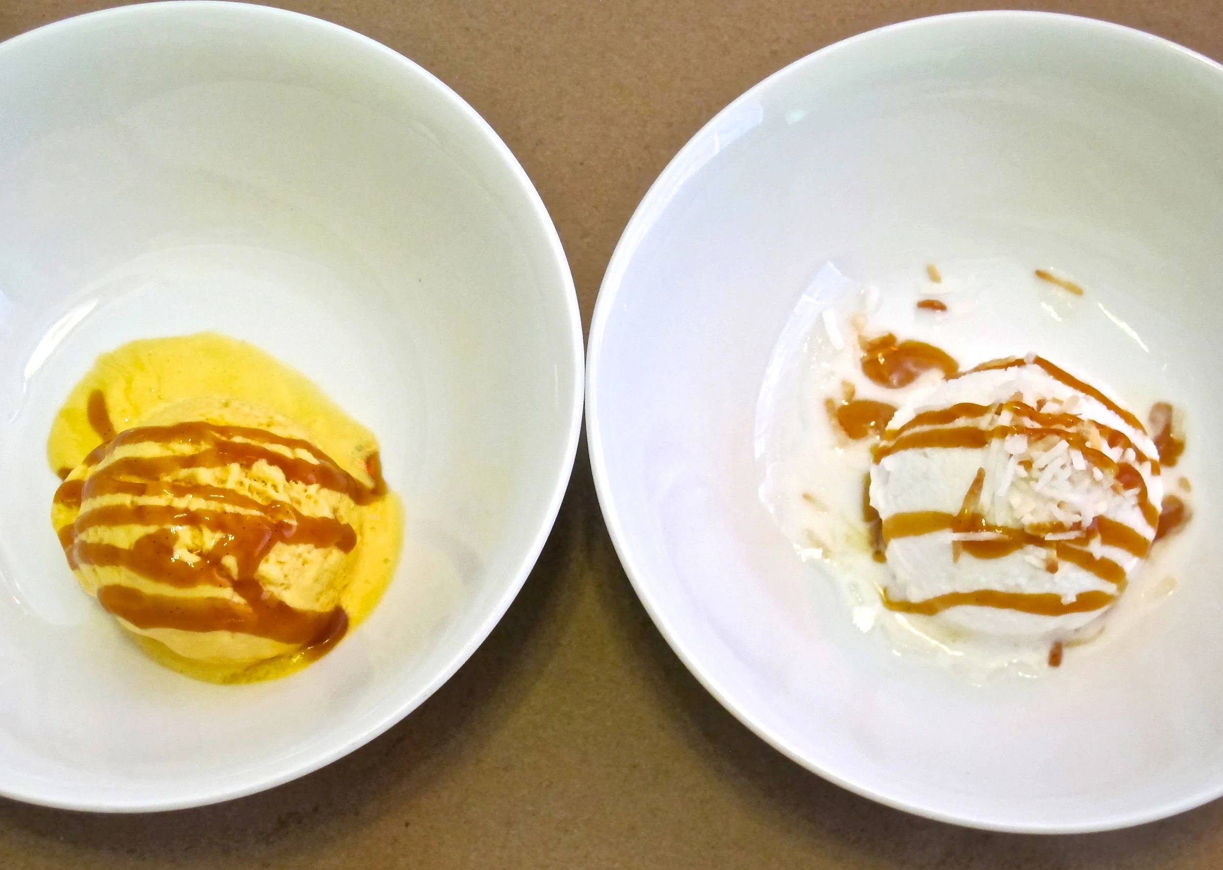 Coconut ice cream and mango sorbet with a passion fruit caramel sauce cooled our palates at the end of our meal.